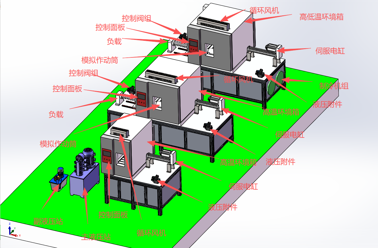 试验台架1由1个组件级试验模块、1个液压产品级试验模块和高低温温度箱等部分组成。